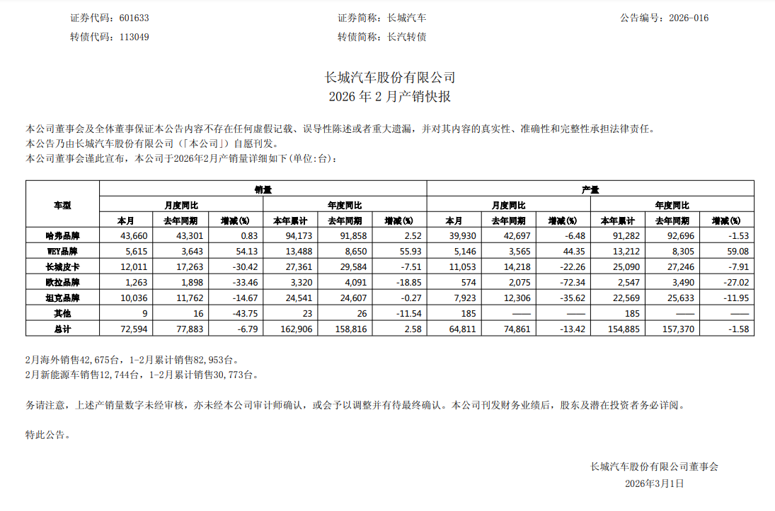 2026年2月公司销量为72594辆,同比下降6.79%;产量为64811辆,同比下降13.42%。